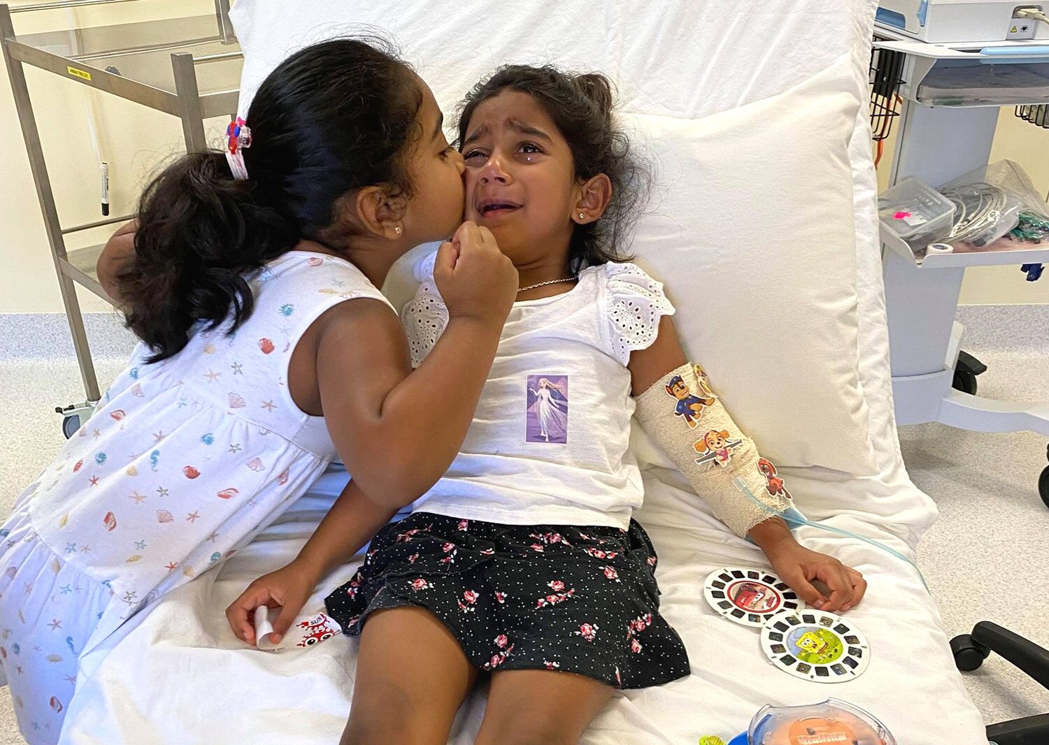 A tamil family from billela have been granted the right to remain in australia until the final hearing of their deportation case. The family were removed from the plane and are currently in accommodation in darwin. The youngest daughter of the biloela family detained on christmas island has been medically evacuated to perth with a suspected blood infection. The youngest member of the tamil family, also known as the 'biloela family', turns four next week and was reportedly sick for 10 days with vomiting, diarrhoea and a temperature above 40 degrees. Priya and nades murugappan and daughters tharunicaa, two, and kopika, four, had previously settled in the queensland township of biloela.
